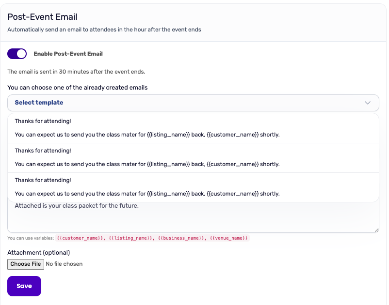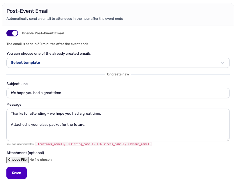 You can optionally attach a file to your post-event email — great for things like a feedback form, discount PDF, or event recap. Click Choose File to upload your attachment before saving.