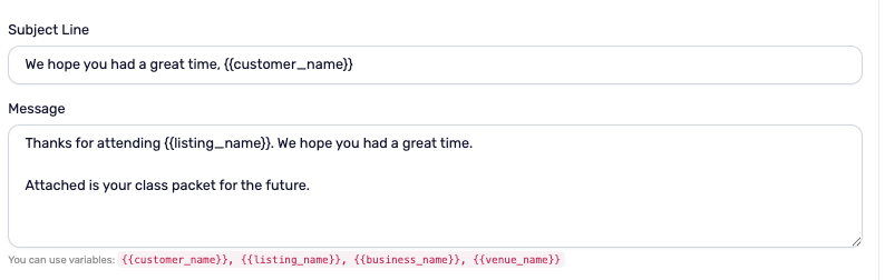 {{customer_name}}— The customer's name{{listing_name}}— The name of the listing{{business_name}}— Your business name{{venue_name}}— The venue where the event took place