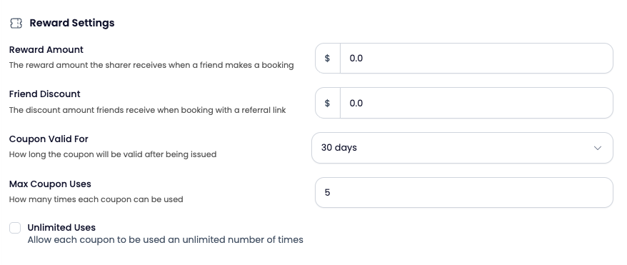 - Referrer reward — the coupon your customer receives when a friend books using their link.