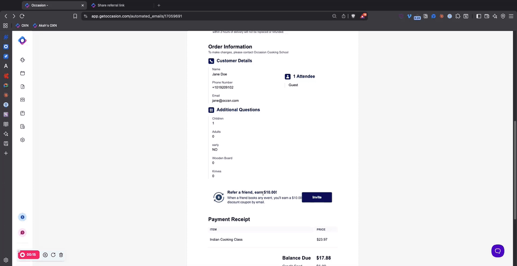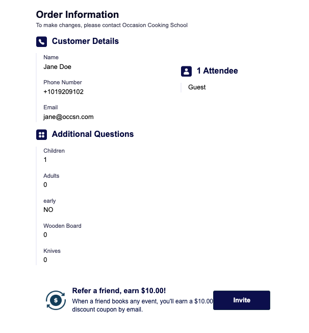 - After booking, your customer sees a prompt on their order confirmation page and in their confirmation email inviting them to share their unique referral link.