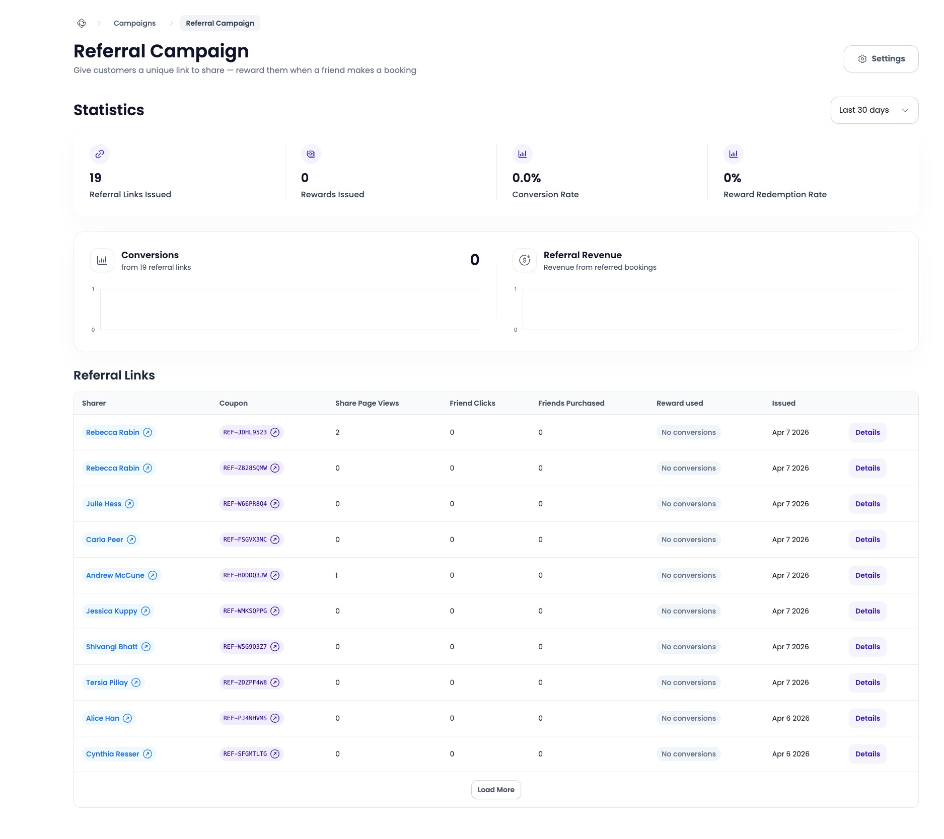 - Conversion Rate — the percentage of referral links that resulted in a booking.