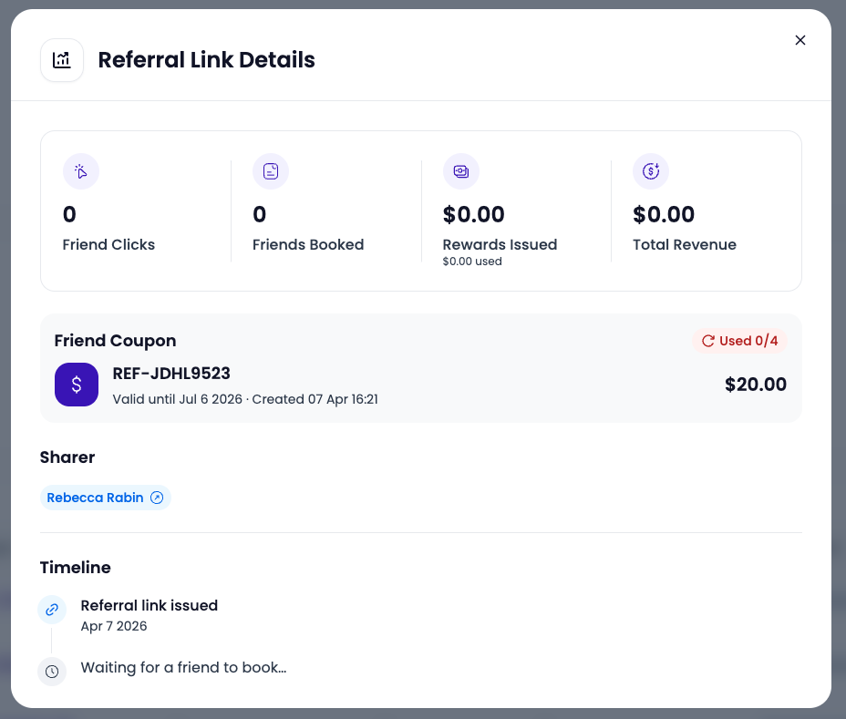 Click Details on any row to see a deeper breakdown for that specific referral link — including friend clicks, friends booked, rewards issued, total revenue generated, the friend's coupon code and usage, and a timeline of activity.
